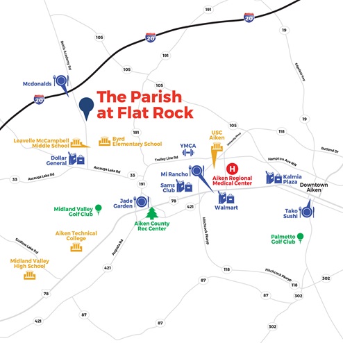 Located less than one mile from I-20, Graniteville, SC offers suburban charm with big city convenience. Just minutes to historic Aiken, but also a short drive to Augusta, GA, The Parish at Flat Rock is close to shopping, dining, recreation and entertainment.