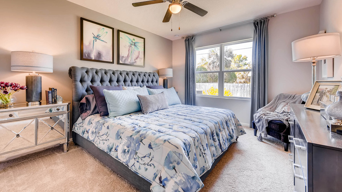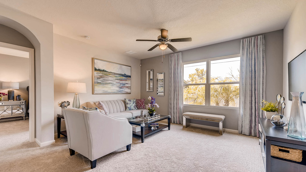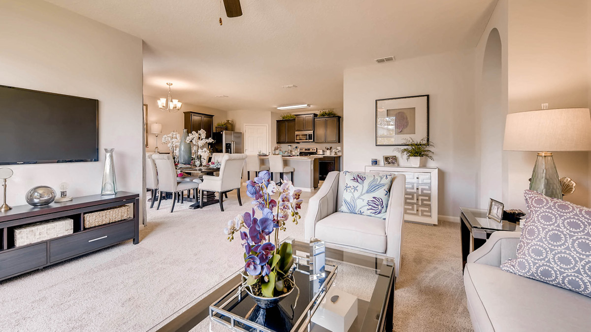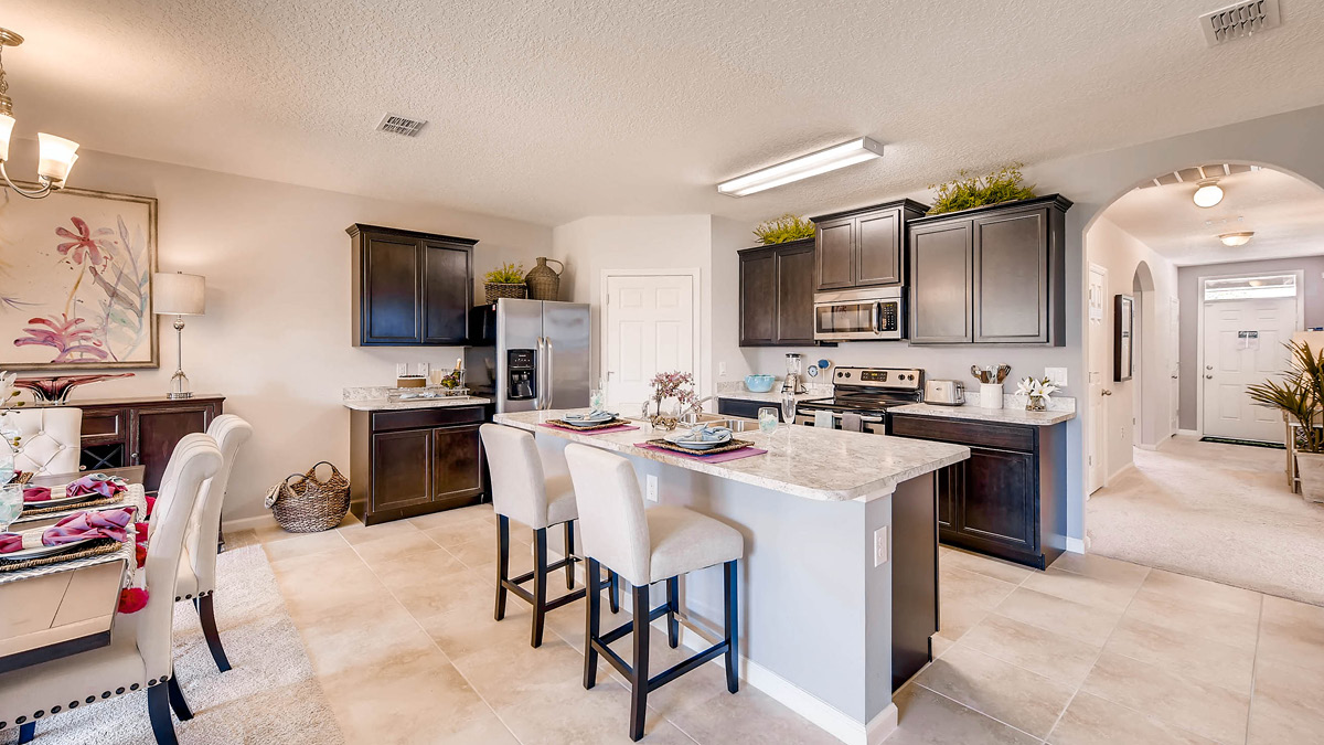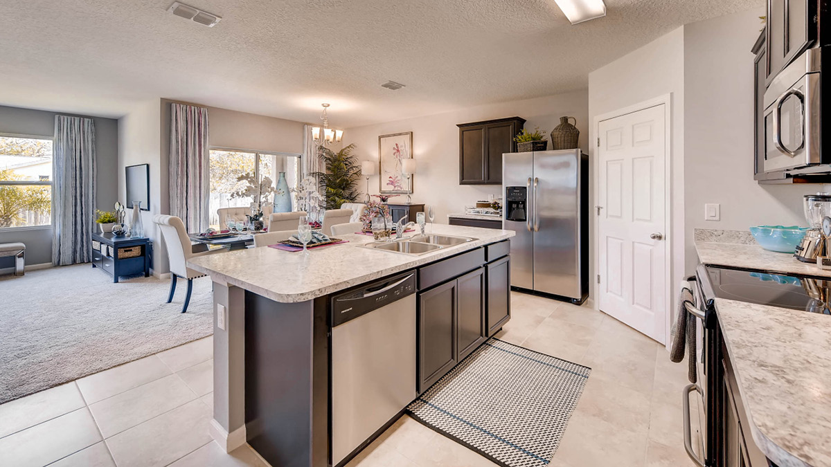 Upon entering, you’re welcomed by a spacious foyer that leads into the heart of the home. The open-concept design seamlessly connects the living room, dining area, and kitchen, making it ideal for entertaining. The large living room is flooded with natural light, showcasing scenic views through oversized windows. With ample seating space, it’s perfect for both relaxation and socializing. The kitchen is a standout, offering quartz countertops, an oversized single-bowl undermount sink, stainless-steel appliances, a walk-in pantry, and a large island with a breakfast bar. Whether preparing a casual meal or hosting a dinner party, this kitchen meets every culinary need. The four generously sized bedrooms provide versatility for various lifestyles. The primary suite, located at the rear of the home, serves as a serene retreat, featuring a private ensuite bathroom with dual undermount sinks, a separate shower, and a walk-in closet. The other three bedrooms share a well-appointed bathroom, simplifying busy mornings. Laundry is a breeze with a dedicated space conveniently located near all bedrooms. Like all Palm Bay Spot Lot homes, the Cali includes smart home technology, allowing you to control your home from anywhere with your smart device.