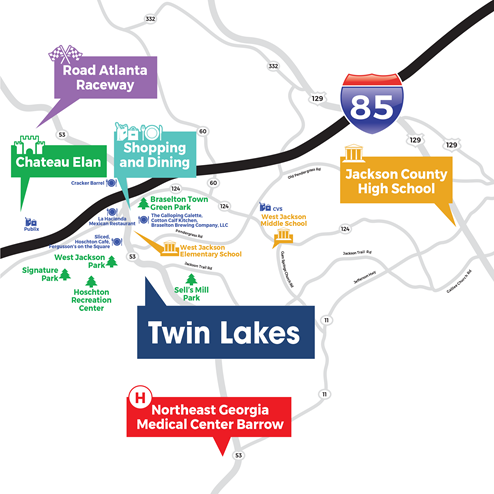 Twin Lakes is located in the City of Hoschton, a picturesque town just off I-85 in Jackson County in north Georgia, about 35 miles northeast of the Atlanta perimeter. Jackson County is included in the 10 fastest growing counties in the country yet offers an abundance of open spaces and unspoiled views of the state’s Piedmont Region, just south of the Blue Ridge Mountains. This city offers the advantage of small town living and the convenience of being less than 45 minutes from urban areas such as Athens, Gainesville and metro Atlanta for shopping, dining and entertainment.