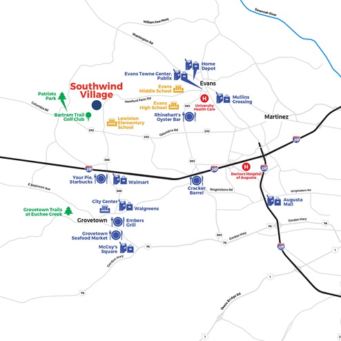This swim community is in the heart of beautiful Evans, Georgia, which was voted one of the Best Towns for Families by Family Circle Magazine. With picturesque landscapes, a medley of restaurants, boutique shops and exciting outdoor activities, this small town offers big city convenience. Grocery stores, retail and coffee shops are less than 5 miles away. Plus downtown Augusta and Fort Eisenhower are only a short drive.