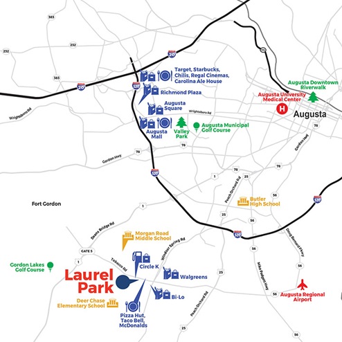 Laurel Park in Hephzibah, GA is a townhome community located just 5 minutes from Fort Eisenhower and close to I-520. Designs offer 3 and 4 bedrooms, 2 full baths and a convenient powder room covering 1,435 to 1,866 sq feet. Depending on the plan, there is a one car garage or a two car garage, offering space for vehicles plus extra storage.