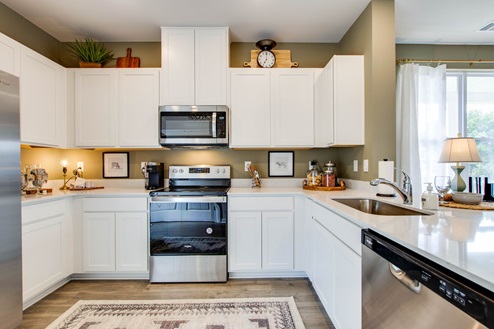 Right as you step inside, you’ll notice the high quality of interior features in Campbell Place’s townhomes. Boasting quartz countertops in all the kitchen and bathrooms, wood-styled Revwood laminate flooring, and new stainless-steel appliances, floorplans here are the picture of modern elegance. The exterior features are just as impressive, including James Hardie® siding with brick and stone accents and thoughtfully landscaped front yards. Our townhomes also come equipped with smart home technology, letting you control everything from lighting to temperature from the convenience of your smart device.