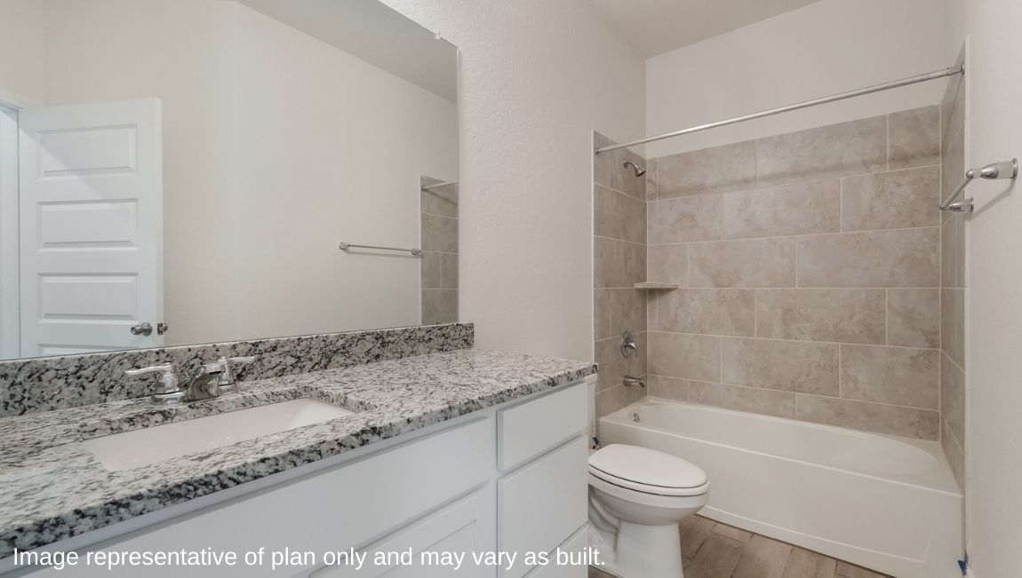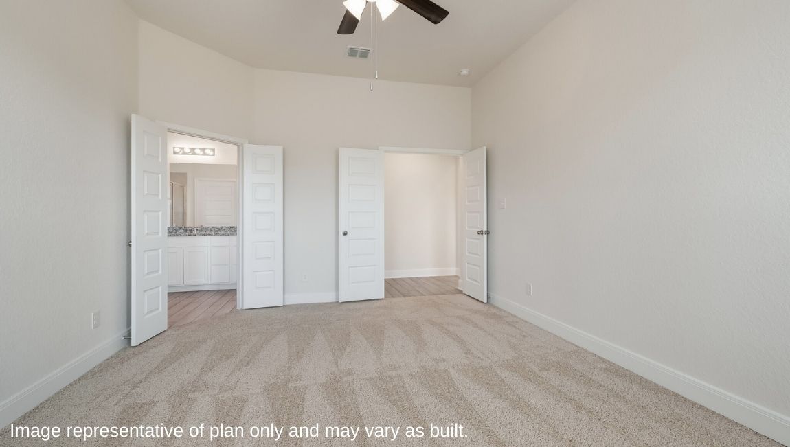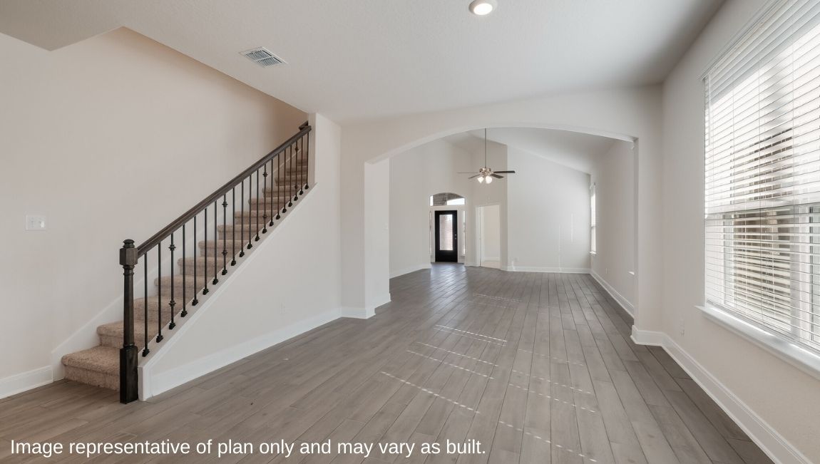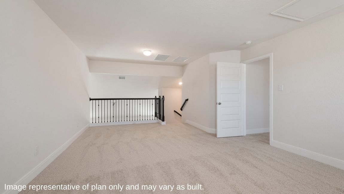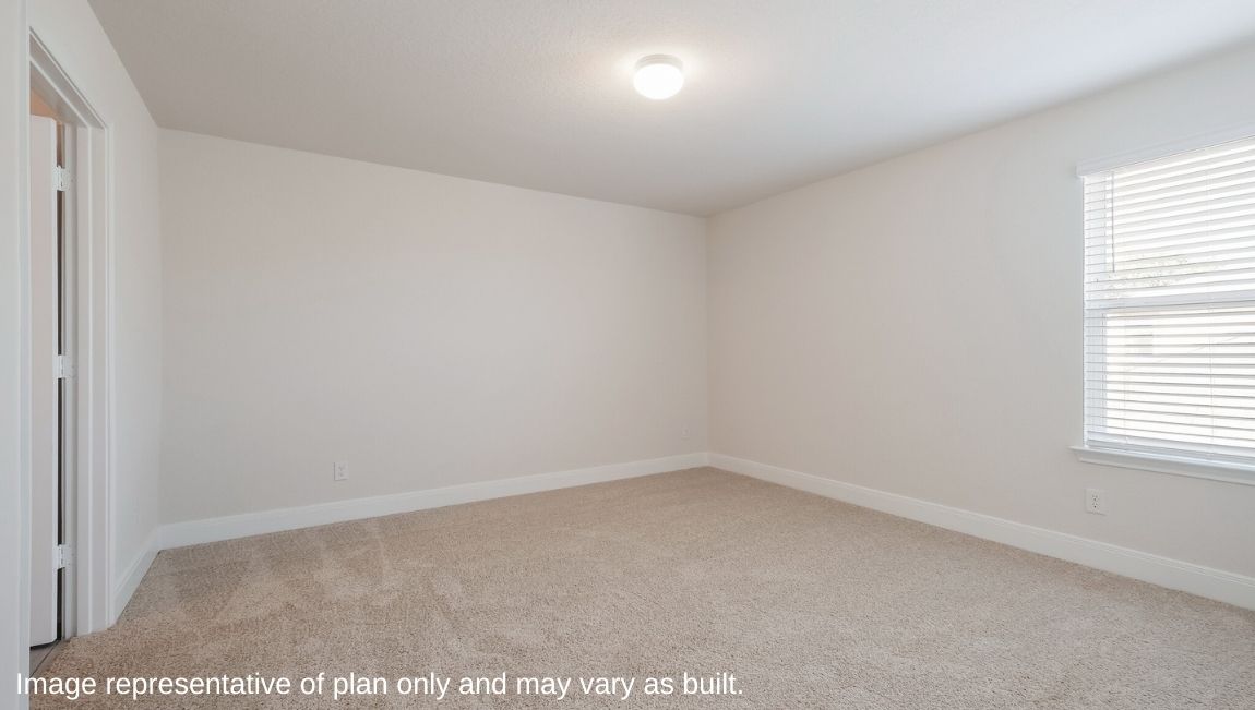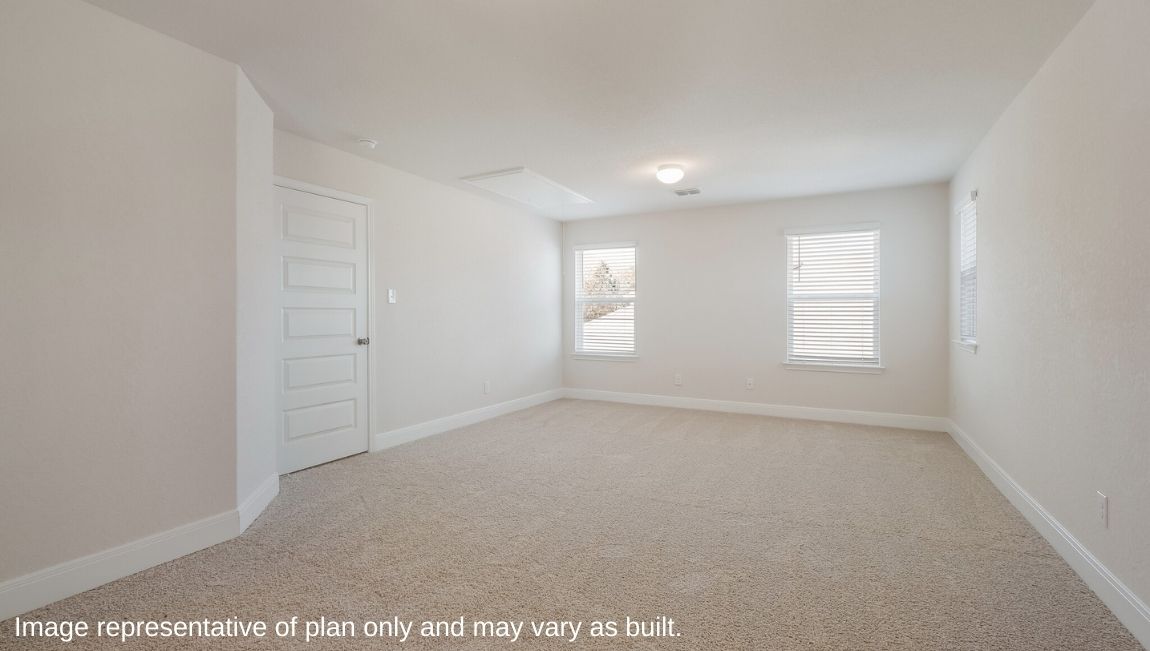 The private main bedroom suite is located off the kitchen and dining area and includes quality carpet flooring, large windows for plenty of natural light and a ceiling fan. Your attached main bathroom features dual vanity sinks, a tiled walk-in shower, shaker style cabinets, and an oversized walk-in closet. Your first story is complete with a dedicated office space, two secondary bedrooms with walk-in closets, a second full bathroom, a powder room and a utility room with tile floors. A versatile loft greets you at the top of the stairs and is a perfect entertainment area. Your guests will love their own bedroom and full bathroom located off the loft. Additional features include tall 9-foot ceilings, 2-inch faux wood blinds throughout the home, pre-plumb for water softener loop, natural gas and more! You’ll enjoy added security in your new home with our Home is Connected features. Using one central hub that talks to all the devices in your home, you can control the lights, thermostat and locks, all from your cellular device. Contact us today by clicking the text with us button or the request information button and receive more information about The Hondo floor plan at Riverstone at Westpointe.