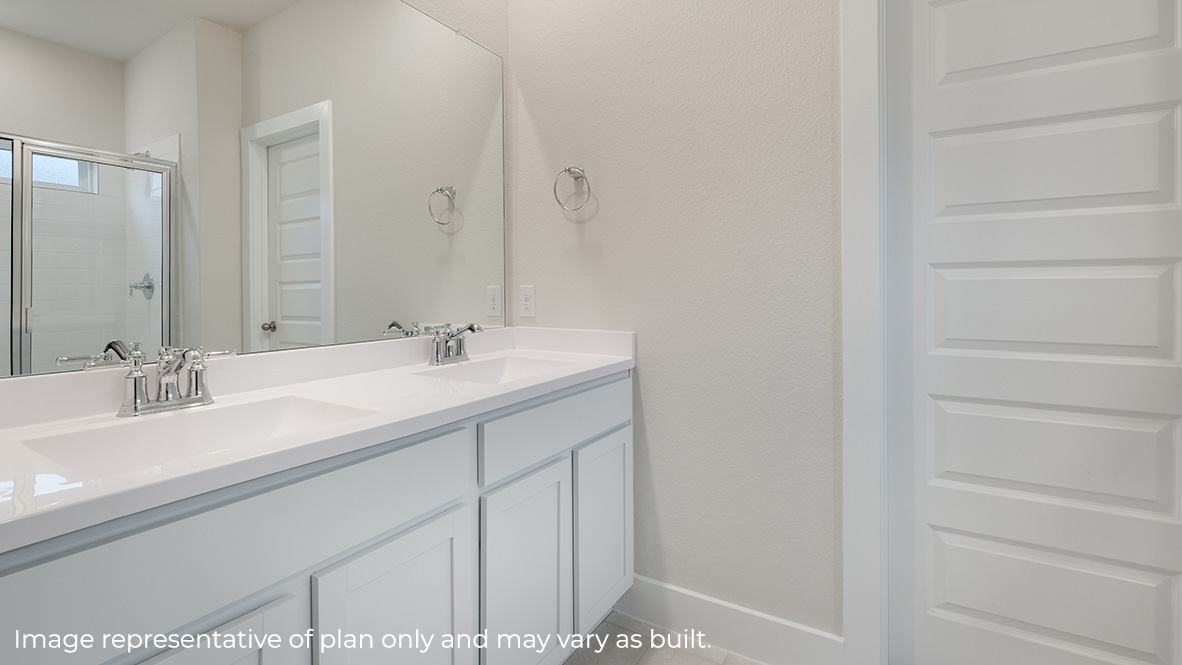 The Ozark plan is one of our two-story homes featured at Riverstone at Westpointe in San Antonio, TX. This new home layout offers 2 classic front exteriors, 4 bedrooms, 3 bathrooms, 2 car-garage and 2462 sq. ft. of comfortable living. The Ozark features a gorgeous elongated front porch that opens into a foyer leading to the blended kitchen, living room and dining area. The wide open kitchen overlooks your living area so you won't miss a thing while preparing meals. Additional kitchen features include spacious granite countertops, classic white subway tile backsplash, stainless steel appliances, shaker style cabinets and a walk-in corner pantry. The downstairs main bedroom is located privately at the back of the home and features quality carpet flooring, a ceiling fan and an ensuite bathroom complete with double vanity sinks, a huge walk-in closet and a tiled walk-in shower.