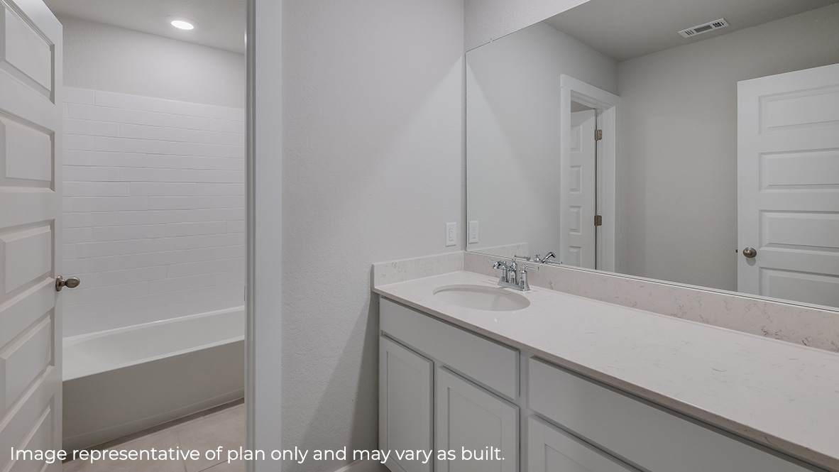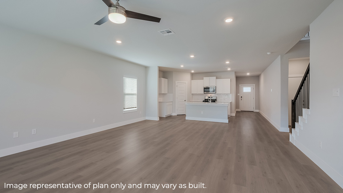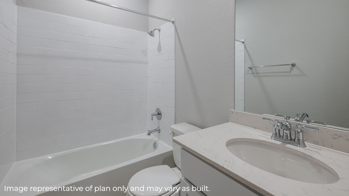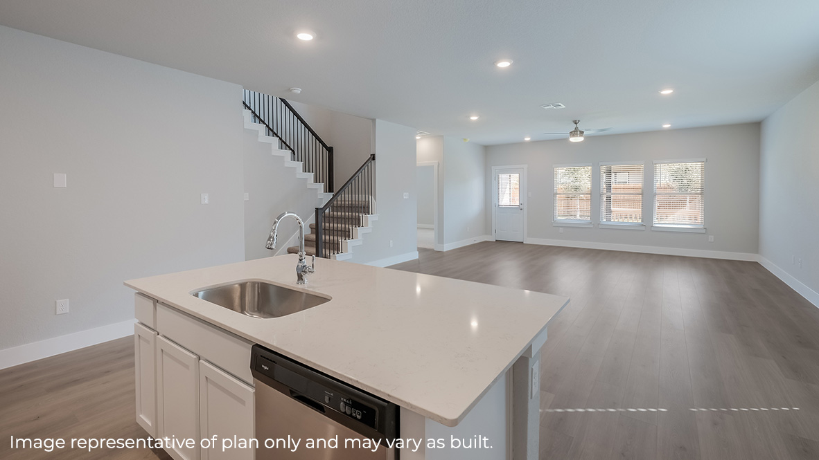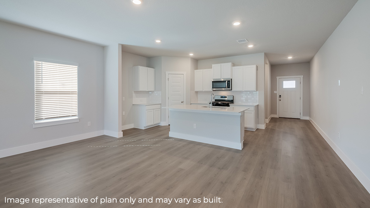 Welcome to The Rosemont floor plan, a large two-story home located at Riverstone at Westpointe in San Antonio, TX. This home features 2 classic front exteriors, 5 bedrooms, 3 bathrooms, a spacious 2-car garage and 2716 square feet of living space. As you enter the home through the foyer, you'll pass one secondary bedroom and bathroom before entering the grand, open-concept kitchen, dining room, and living area. The Rosemont kitchen features granite countertops, classic white subway tile backsplash, stainless steel appliances, a walk-in pantry, and a large kitchen island with a deep, single bowl sink.