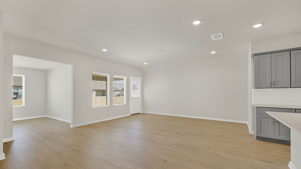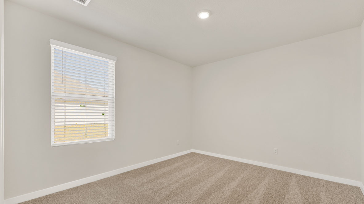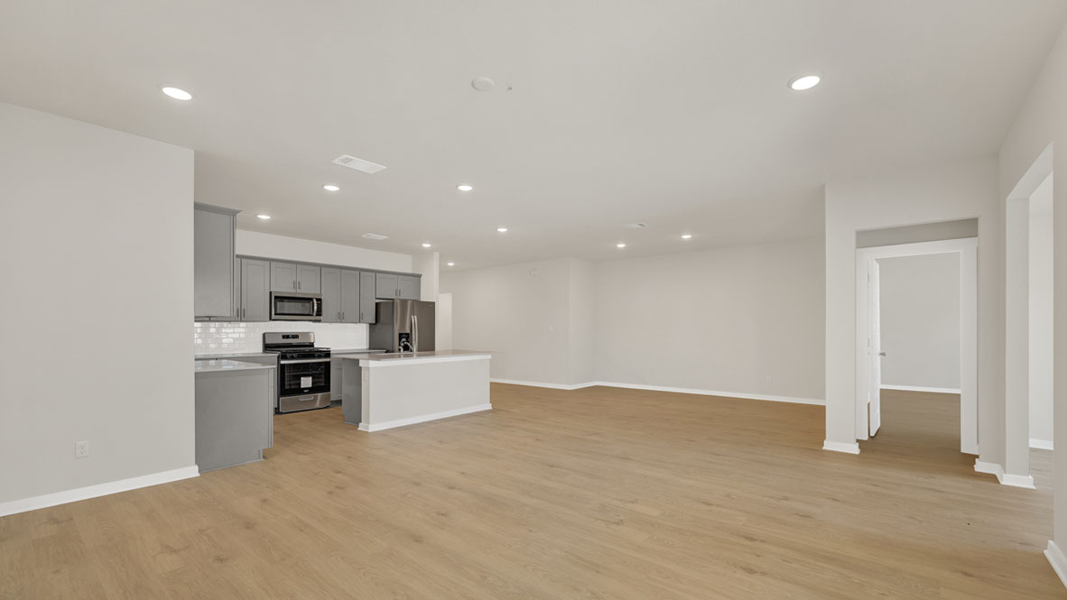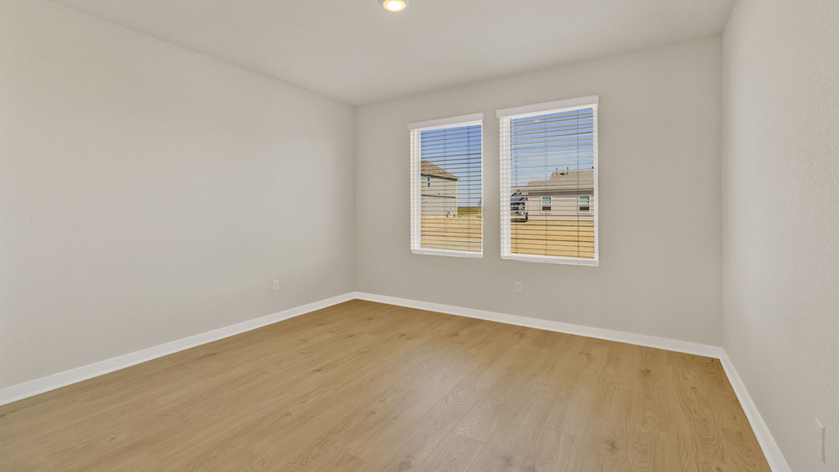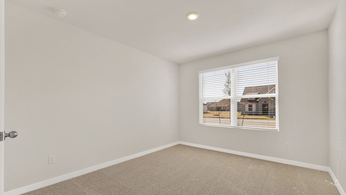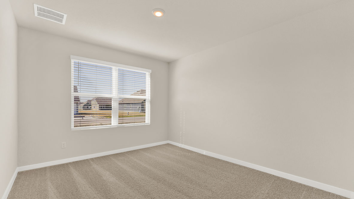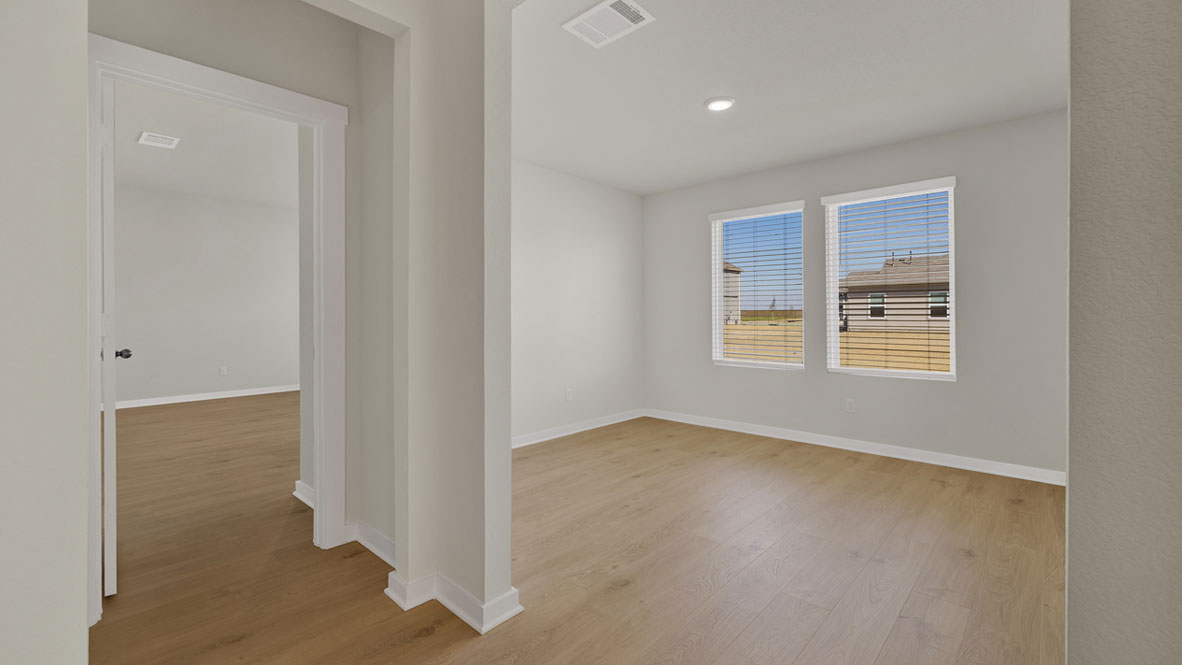 Step inside the home from the covered entryway into the foyer. Down a short hall, you will find the secondary bedrooms, bathroom, and the utility room. Each bedroom includes a closet with shelving and the secondary bathroom features a shower/tub combination as well as a private door to the toilet and shower area. Moving through the short foyer, you will enter the kitchen, dining and family room. This spacious open concept living space will become your retreat at the end of the day. The kitchen includes an island with undermount sink, quartz countertops, decorative tile backsplash, a corner pantry closet, stainless-steel appliances and 36’’ upper cabinets. The family room opens to the bright study, perfect for a home office or library. The primary bedroom is tucked away off the family room and includes a private bathroom with his and hers closets. Enjoy the luxurious 5’ walk in shower, raised cultured marble vanity with double sinks, and separate entrance to the toilet for privacy. The Holden includes vinyl flooring throughout the common areas of the home and the primary bedroom, and carpet in the secondary bedrooms. All our new homes feature a covered back patio, full sod, an irrigation system in the front and back yard, and full gutters. This home includes our America’s Smart Home base package, which includes the Amazon Echo Pop, Front Doorbell, Front Door Deadbolt Lock, Home Hub, Thermostat, and Deako® Smart Switches. Contact us today and find your home at Hartland Ranch.