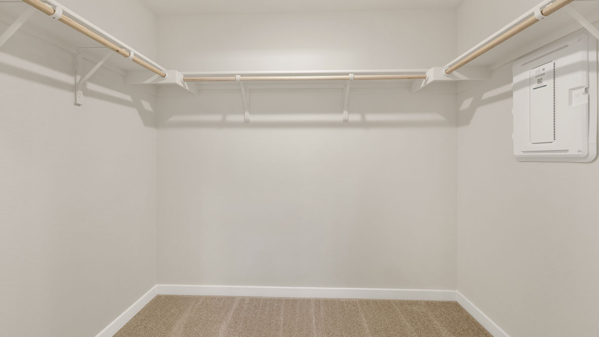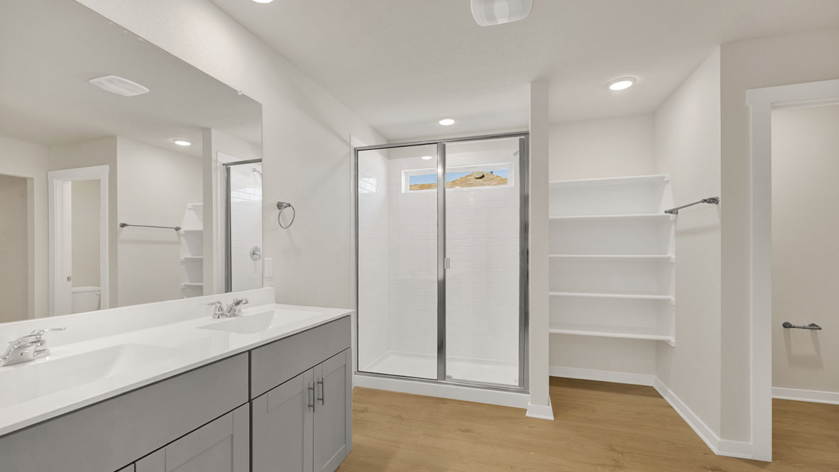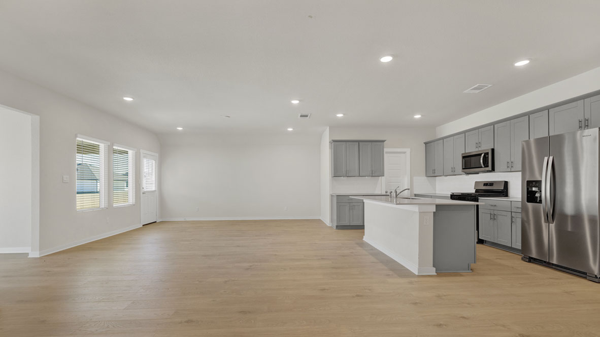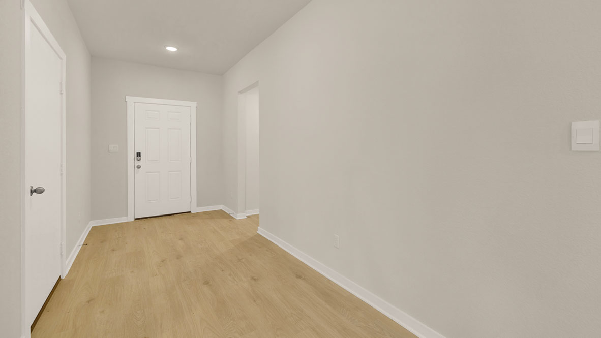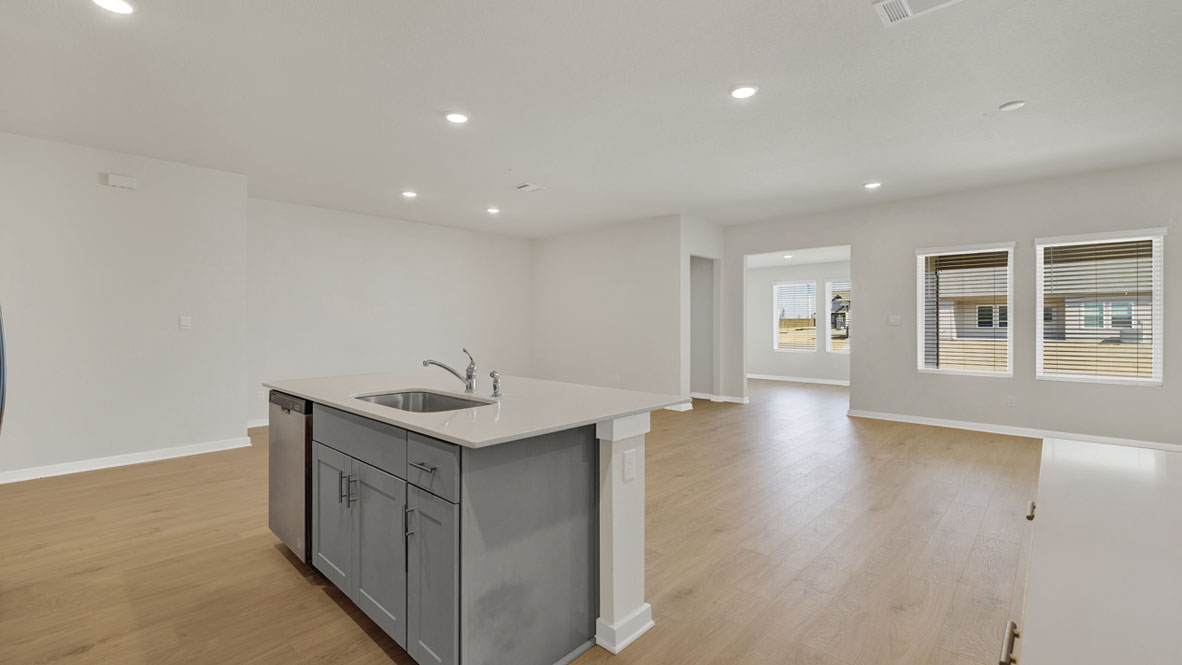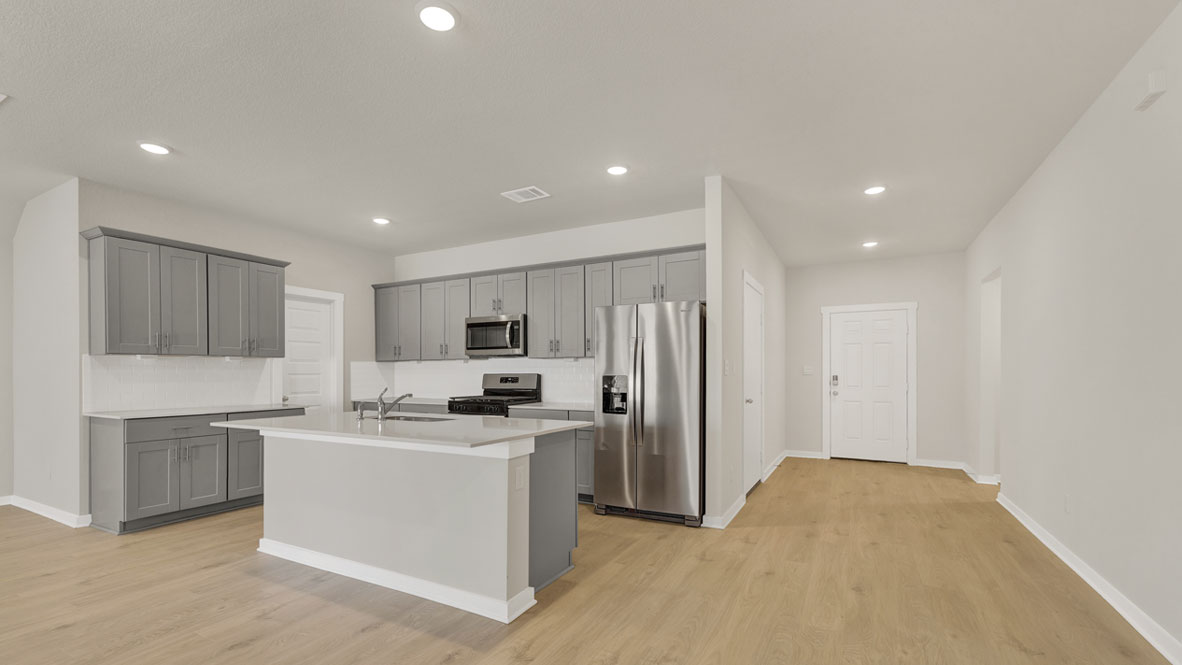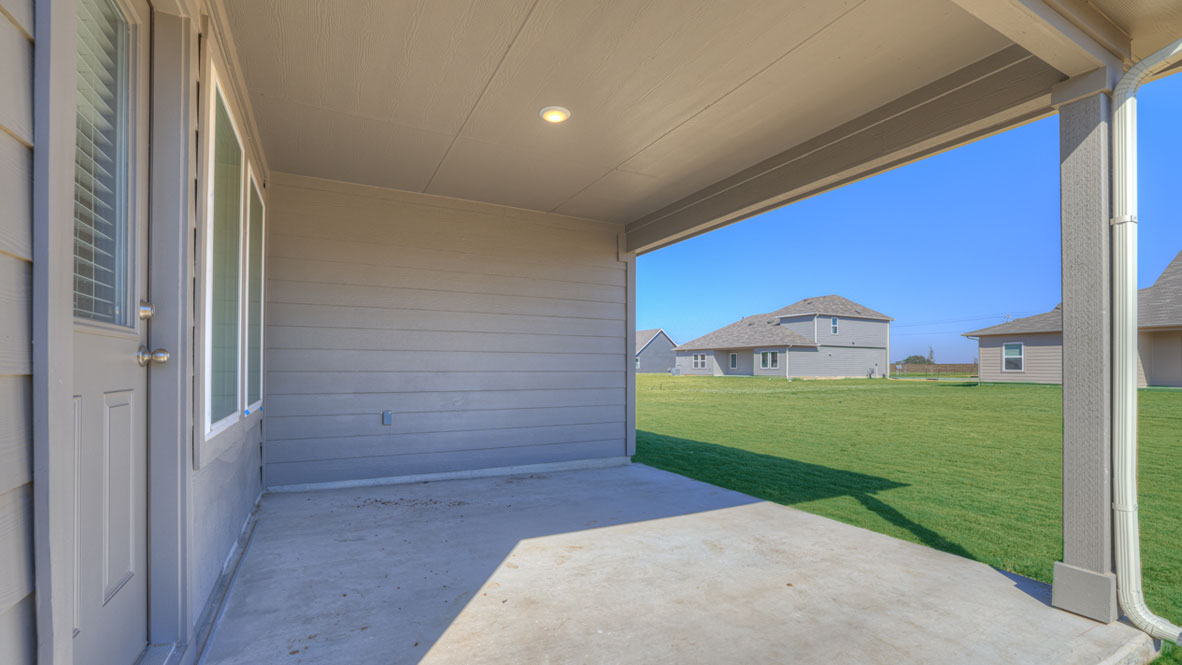 Step inside the home from the covered entryway into the foyer. Down a short hall, you will find the secondary bedrooms, bathroom, and the utility room. Each bedroom includes a closet with shelving and the secondary bathroom features a shower/tub combination as well as a private door to the toilet and shower area. Moving through the short foyer, you will enter the kitchen, dining and family room. This spacious open concept living space will become your retreat at the end of the day. The kitchen includes an island with undermount sink, quartz countertops, decorative tile backsplash, a corner pantry closet, stainless-steel appliances and 36’’ upper cabinets. The family room opens to the bright study, perfect for a home office or library. The primary bedroom is tucked away off the family room and includes a private bathroom with his and hers closets. Enjoy the luxurious 5’ walk in shower, raised cultured marble vanity with double sinks, and separate entrance to the toilet for privacy. The Holden includes vinyl flooring throughout the common areas of the home and the primary bedroom, and carpet in the secondary bedrooms. All our new homes feature a covered back patio, full sod, an irrigation system in the front and back yard, and full gutters. This home includes our America’s Smart Home base package, which includes the Amazon Echo Pop, Front Doorbell, Front Door Deadbolt Lock, Home Hub, Thermostat, and Deako® Smart Switches. Contact us today and find your home at Hartland Ranch.