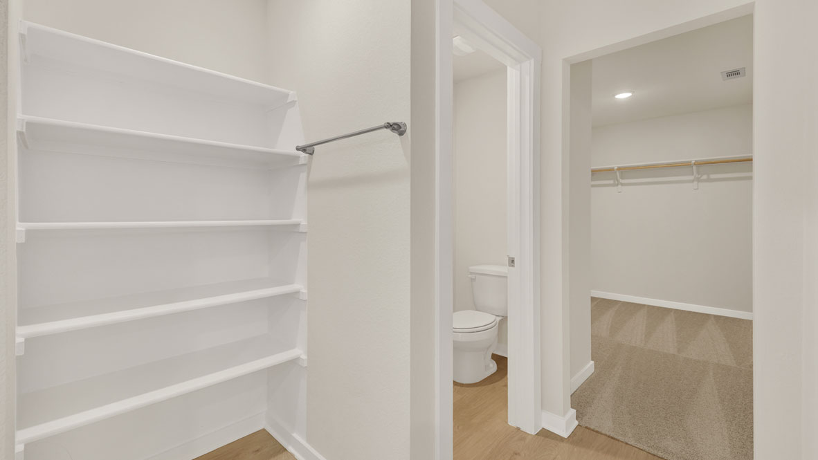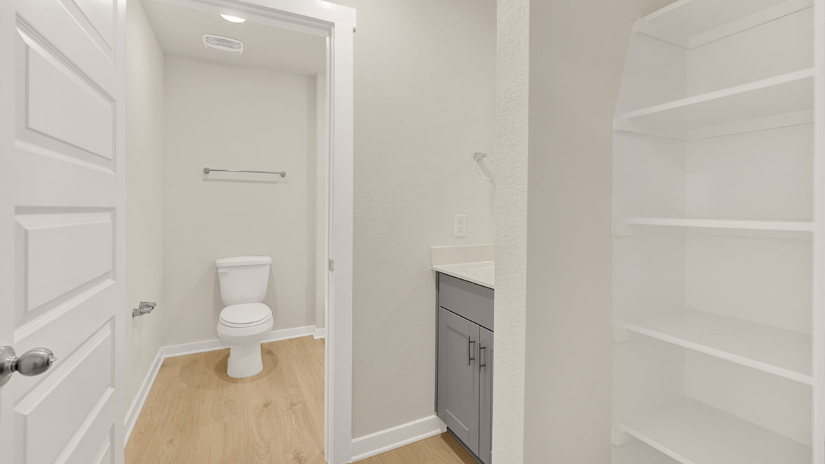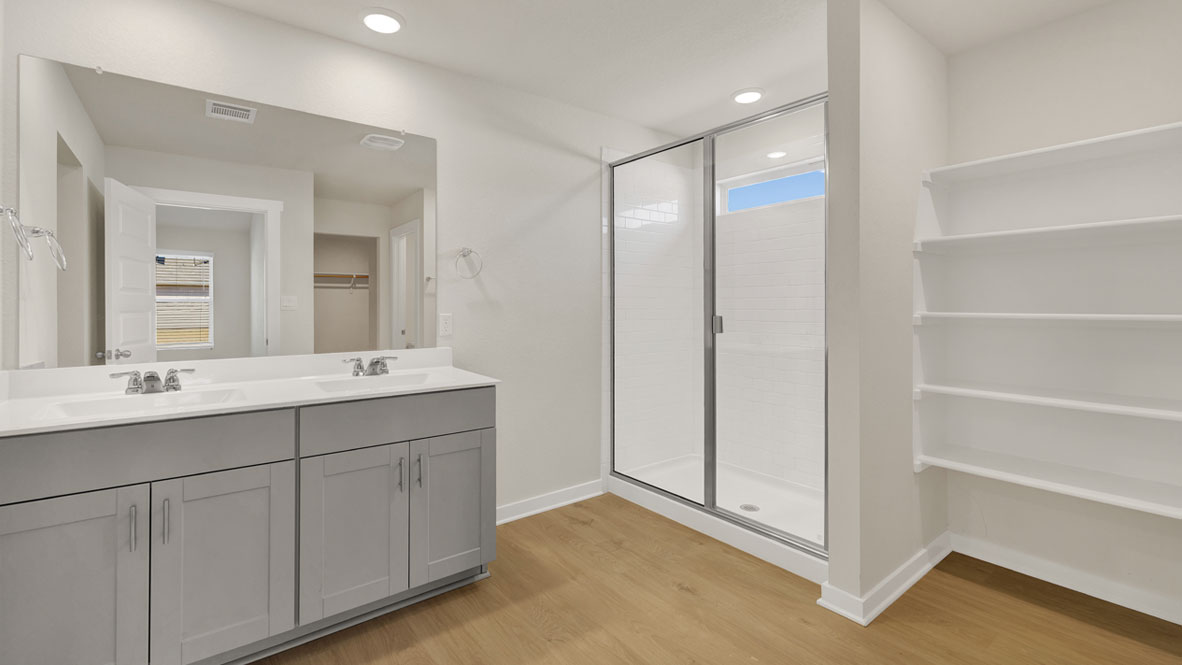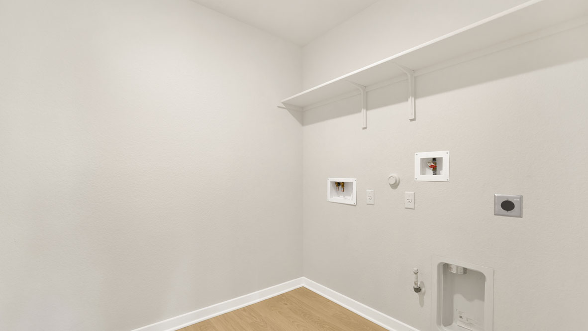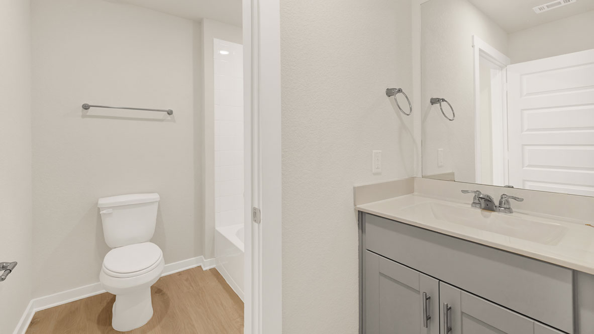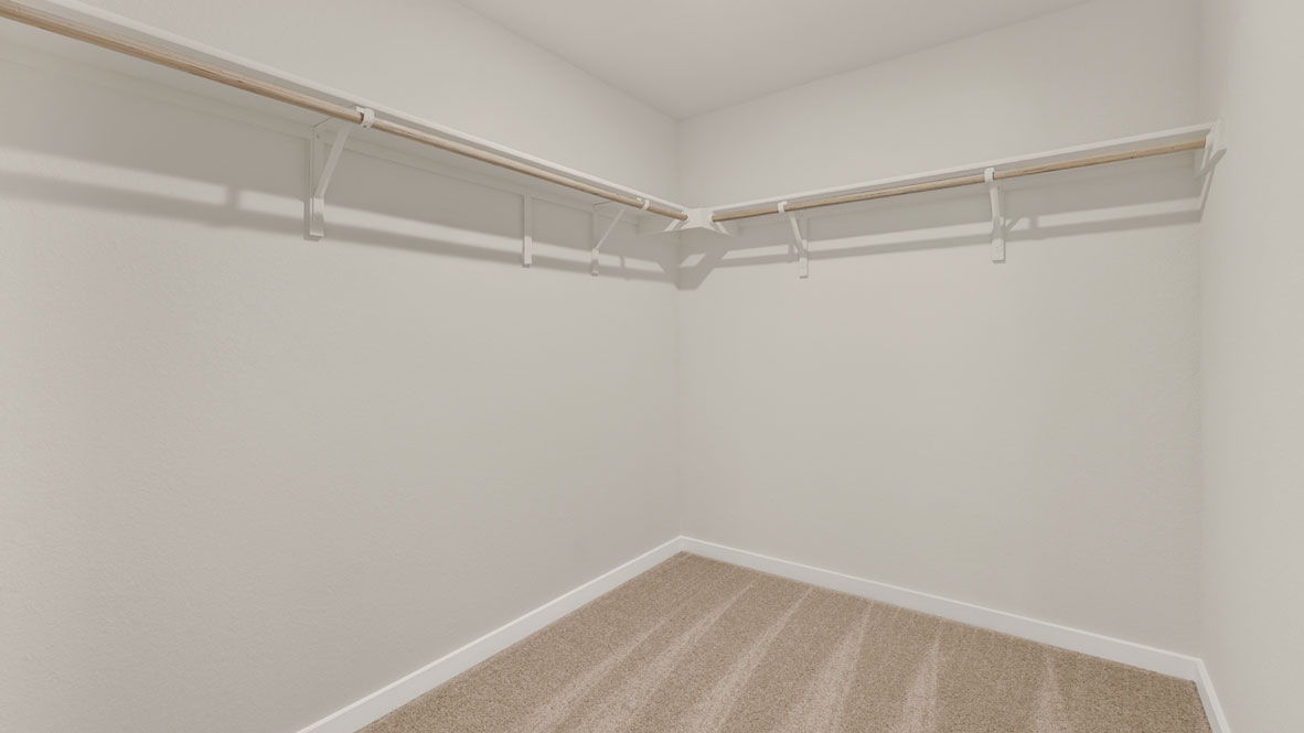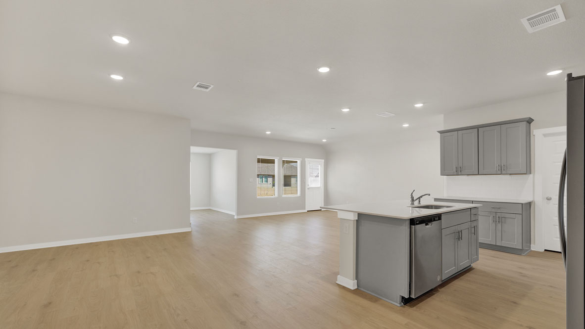 Step inside the home from the covered entryway into the foyer. Down a short hall, you will find the secondary bedrooms, bathroom, and the utility room. Each bedroom includes a closet with shelving and the secondary bathroom features a shower/tub combination as well as a private door to the toilet and shower area. Moving through the short foyer, you will enter the kitchen, dining and family room. This spacious open concept living space will become your retreat at the end of the day. The kitchen includes an island with undermount sink, quartz countertops, decorative tile backsplash, a corner pantry closet, stainless-steel appliances and 36’’ upper cabinets. The family room opens to the bright study, perfect for a home office or library. The primary bedroom is tucked away off the family room and includes a private bathroom with his and hers closets. Enjoy the luxurious 5’ walk in shower, raised cultured marble vanity with double sinks, and separate entrance to the toilet for privacy. The Holden includes vinyl flooring throughout the common areas of the home and the primary bedroom, and carpet in the secondary bedrooms. All our new homes feature a covered back patio, full sod, an irrigation system in the front and back yard, and full gutters. This home includes our America’s Smart Home base package, which includes the Amazon Echo Pop, Front Doorbell, Front Door Deadbolt Lock, Home Hub, Thermostat, and Deako® Smart Switches. Contact us today and find your home at Hartland Ranch.