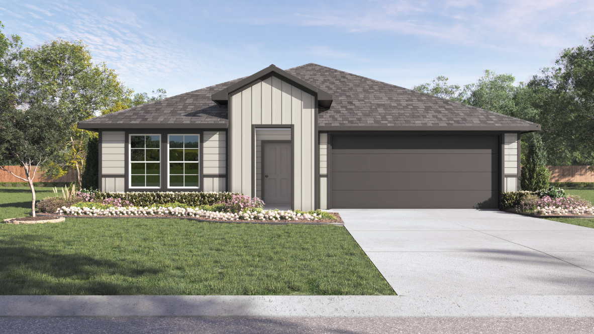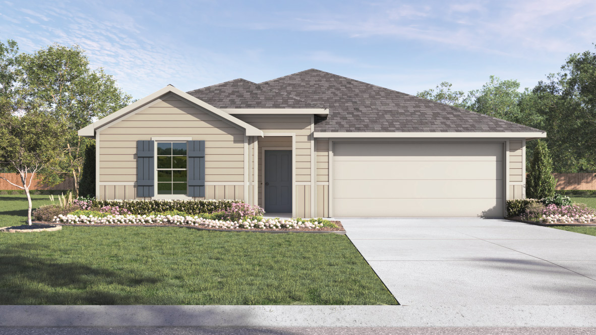 Stepping further into the home, you’ll discover the dining room, kitchen and family room laid out in an open concept design. Built to make cooking, eating, and entertaining a pleasant experience for family and friends, you’re sure to make many memories in this beautiful space. The kitchen includes granite countertops, a large island facing the family room, a walk-in pantry, stainless-steel appliances and 36’’ upper cabinets. Located privately off the dining room are bedrooms 3 and 4, as well as bathroom 3. The primary bedroom is at the back of the house, off the family room, and includes a private bathroom. This relaxing bathroom space features a 5’ walk in shower, vanity, private toilet area with a door, and a walk-in closet. The utility room is outside the primary bedroom, allowing for the laundry chores to be completed with ease. The Lakeway includes vinyl flooring throughout the common areas of the home, and carpet in the bedrooms. All our new homes feature a covered back patio, full sod, irrigation system in the front and back yard, and a 6’ privacy fence around the back yard. This home includes our America’s Smart Home base package, which includes a Front Doorbell, Front Door Deadbolt Lock, Home Hub, Thermostat, and Deako® Smart Switches. Contact us today and find your home at Navarro Fields.